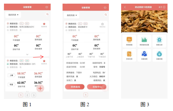 進入APP后會出現(xiàn)圖1所示的界面,能夠看到烤房當(dāng)前的各參數(shù)數(shù)值;能對已綁定烤房進行特別關(guān)注操作; 點擊下箭頭會出現(xiàn)烤房更詳細的當(dāng)前狀態(tài)信息,點擊“烘烤曲線”選項能夠查看此烤房各項指標隨時間的變化的曲線; 點擊“控制中心”選項后會顯示圖3所示控制中心界面。
