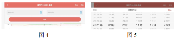 點擊圖3中的“歷史記錄”可以查看此烤房在之前烘烤時各部分的數(shù)值,也可以點擊歷史記錄界面中右上角的“導(dǎo)出”選項對歷史數(shù)據(jù)進行導(dǎo)出。篩選某時間段的曲線, 點擊歷史記錄界面右上角的“篩選”選項,會出現(xiàn)圖4所示的彈窗,點擊圖標,會出現(xiàn)圖5所示選擇時間的彈窗, 選擇所要觀察的時間段的開始時間和結(jié)束時間后,點擊查詢,即可查看選擇時間段內(nèi)的烘烤曲線。